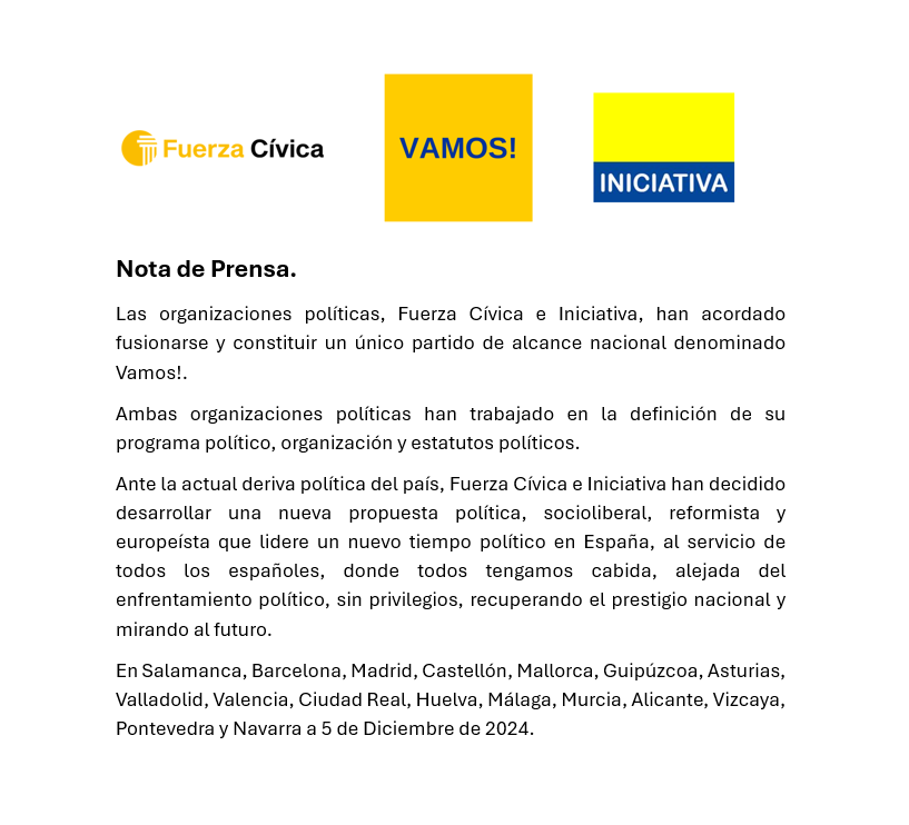 Sumamos la experiencia, valía y vocación de servicio público de los equipos de Iniciativa y Fuerza Cívica para crear un gran proyecto político con capacidad para liderar un nuevo tiempo político en España donde todos tengamos cabida.